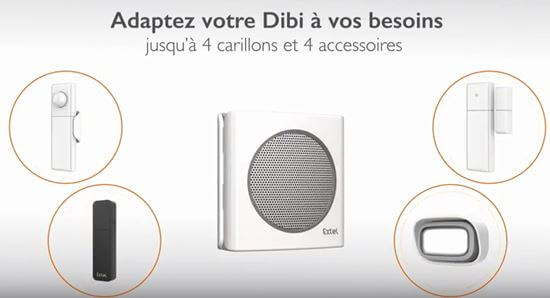 Le détecteur diBi Contact + peut être associé à quatre carillons si vous en avez la nécessité (local professionnel disposant de plusieurs accès), et jusqu'à quatre émetteurs : bouton d'appel, détecteur de mouvement, détecteur d'ouverture de porte/fenêtre ou encore une extension universelle de carillon. Le tout est à retrouver dans la gamme Extel diBi.
