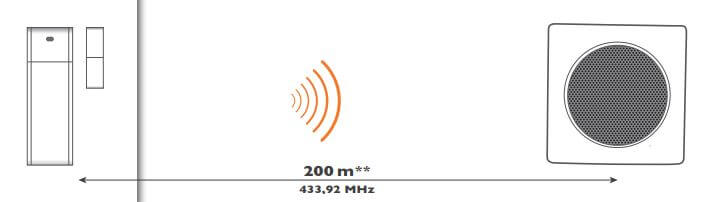 La technologie radio utilisant la fréquence 433.92 MHz permet de faire communiquer ce détecteur avec sa base carillon jusqu'à une distance de 200m en champ libre. La détection se fait quand les deux "boitiers" ne sont plus face à face. Le détecteur déclenchera la sonnerie de votre carillon lors de l'ouverture d'une porte ou d'une fenêtre pour être informé à l'avance de l'arrivée d'un visiteur.