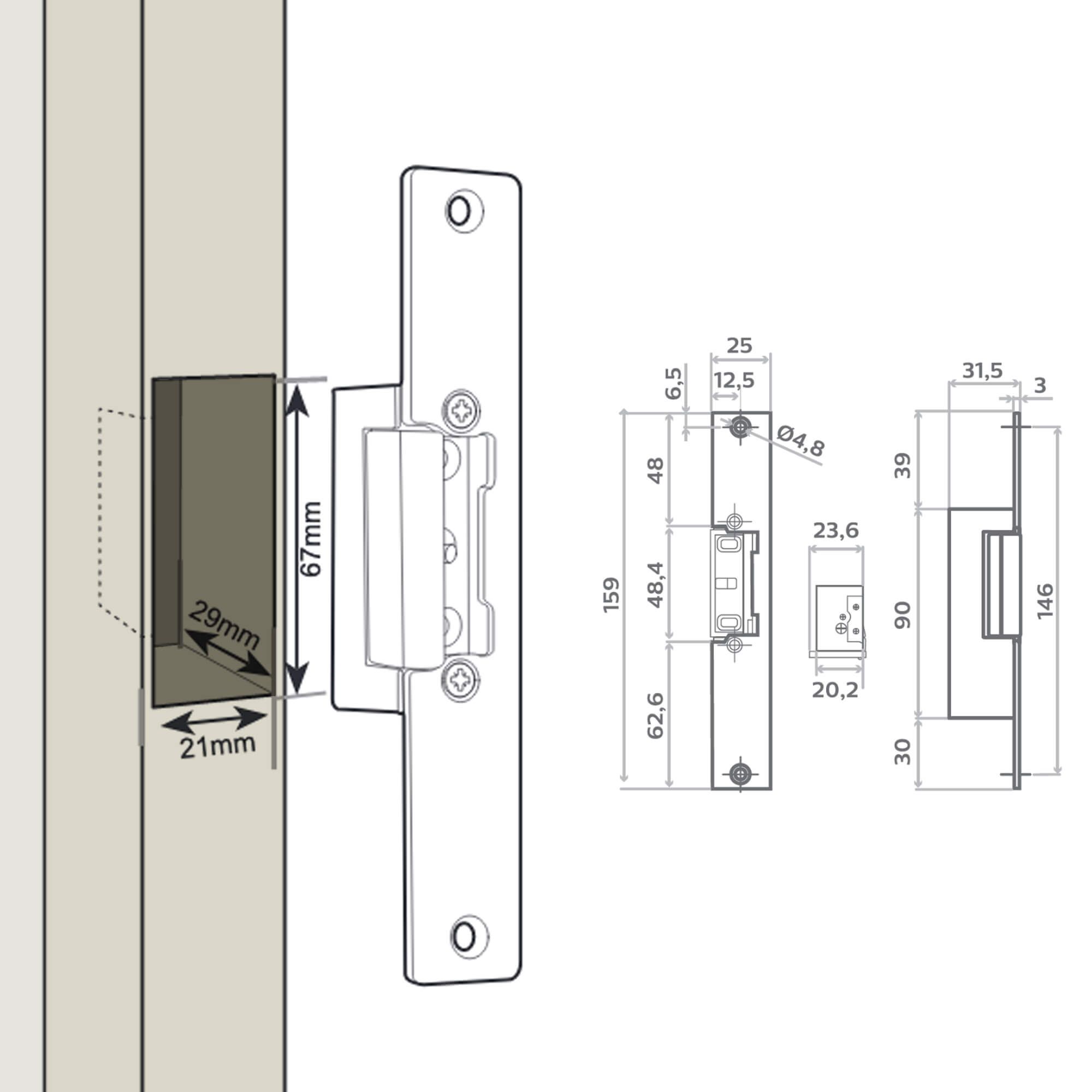 Ce modèle de gâche électrique sans passage de serrure peut être installée sur n'importe quel type de porte ou portillon extérieur. Il est compatible avec toutes les serrures encastrées du marché.