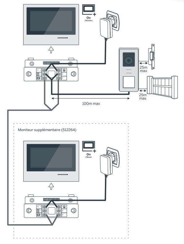 Vous avez parfois besoin de mettre un écran supplémentaire, dans un atelier ou même à l'étage de votre maison afin de gérer au mieux vos accès. C'est tout a fait possible et simple avec ce type de visiophone comme le montre le schéma ci-dessous.